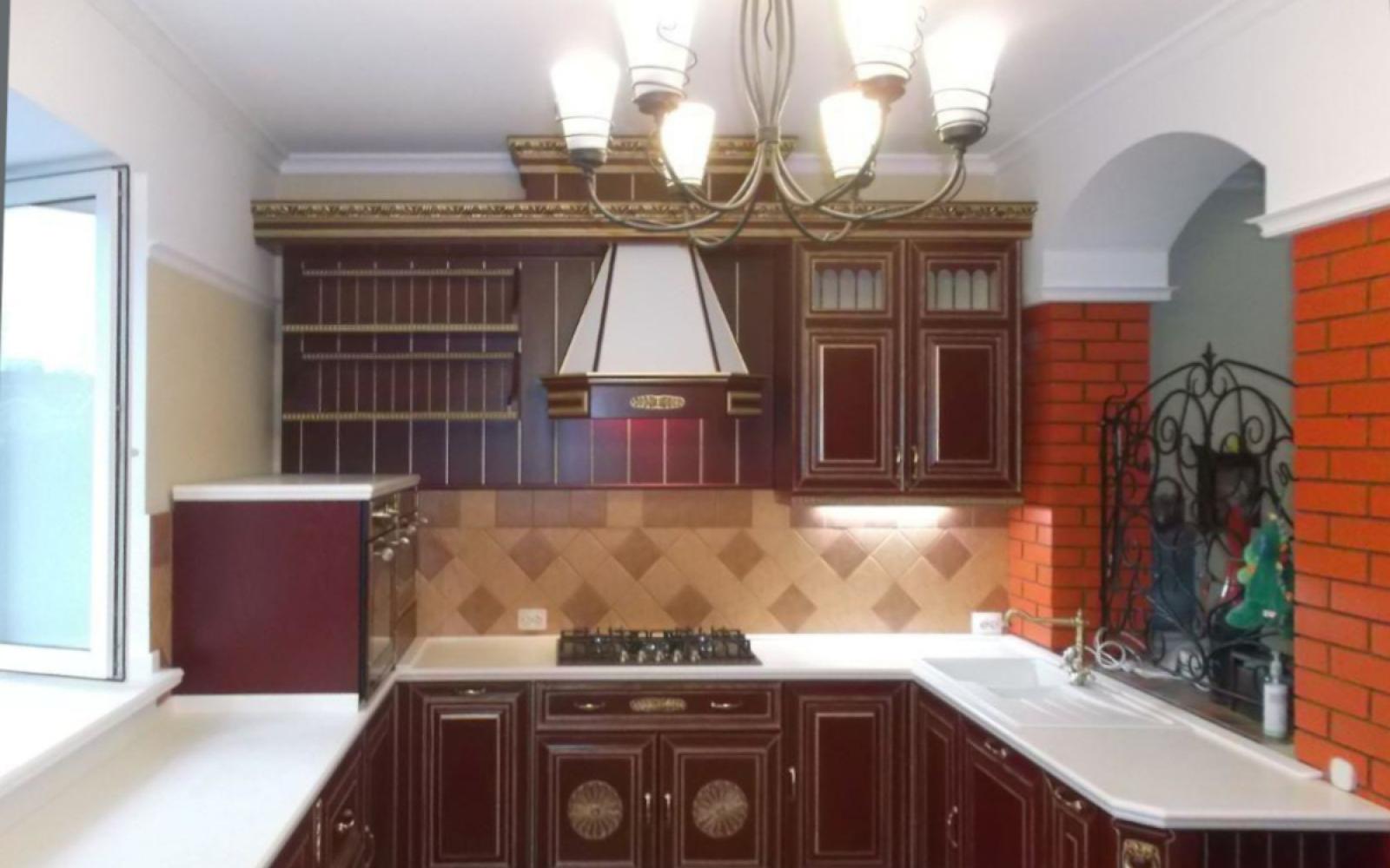 - Классический. Благородный бордовый цвет – нетрадиционное решение для фасадов мебели, но оно позволит подчеркнуть эксклюзивность интерьера. Для оформления пространства можно выбрать гарнитур из МДФ с покрытием шпоном, лаком, эмалью, с резной отделкой. Оттенки бордового можно использовать в оформлении окон, кухонном текстиле, мягкой обивке стульев и др. Столешницу на кухне лучше сделать белого или молочного оттенка.